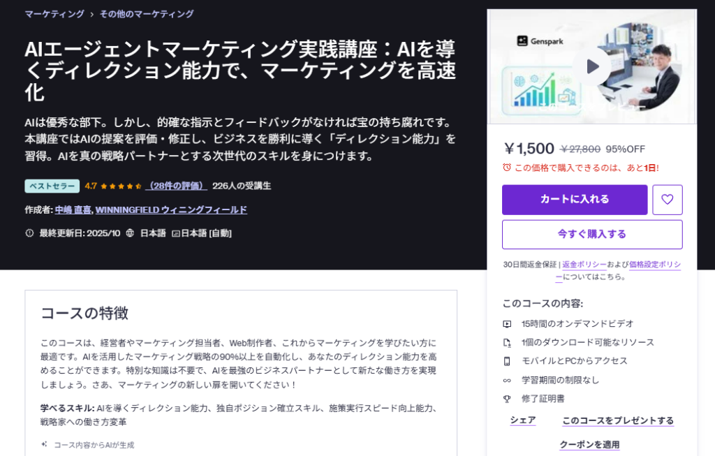 この講座では、AIを使って戦略立案から実行までを自動化する方法を学べます。