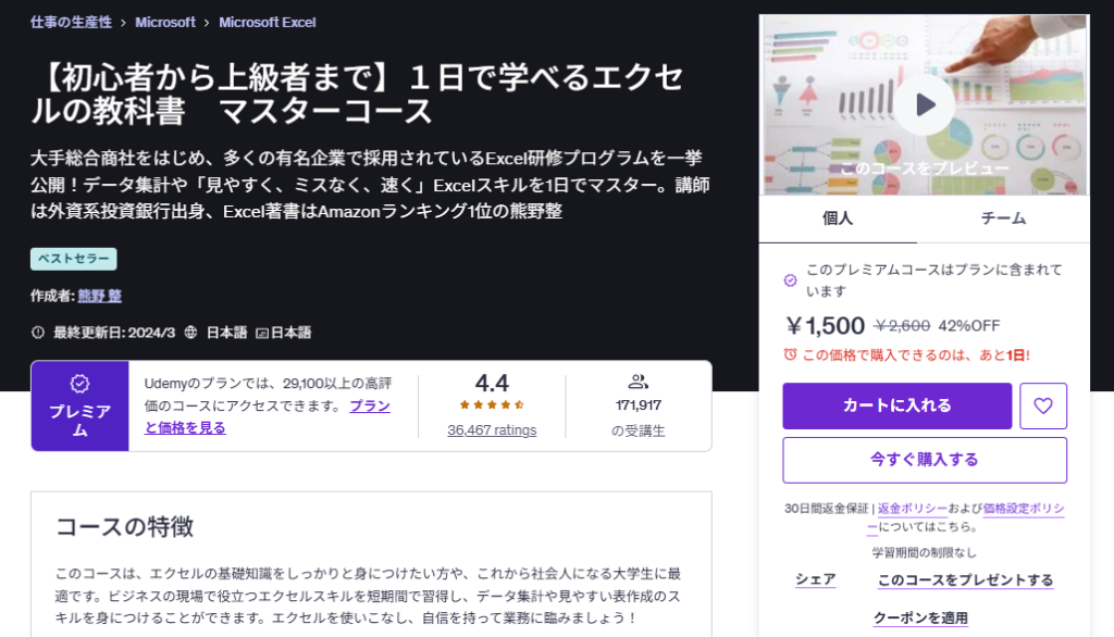 「【初心者から上級者まで】1日で学べるエクセルの教科書 マスターコース」