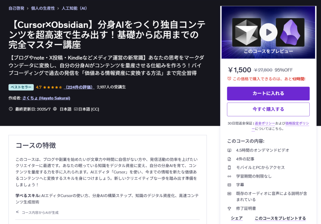 「【Cursor×Obsidian】分身AIをつくり独自コンテンツを超高速で生み出す!基礎から応用までの完全マスター講座」
