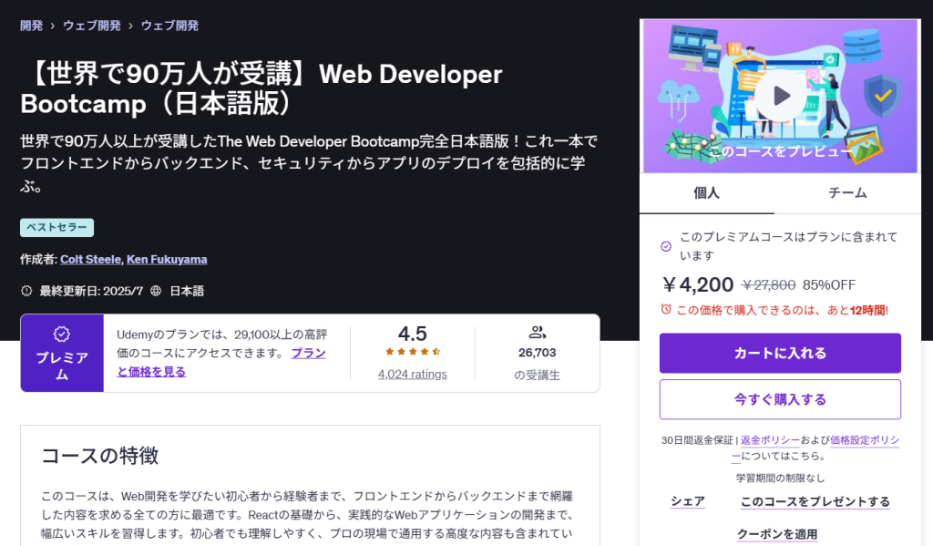 「【世界で90万人が受講】Web Developer Bootcamp(日本語版)」