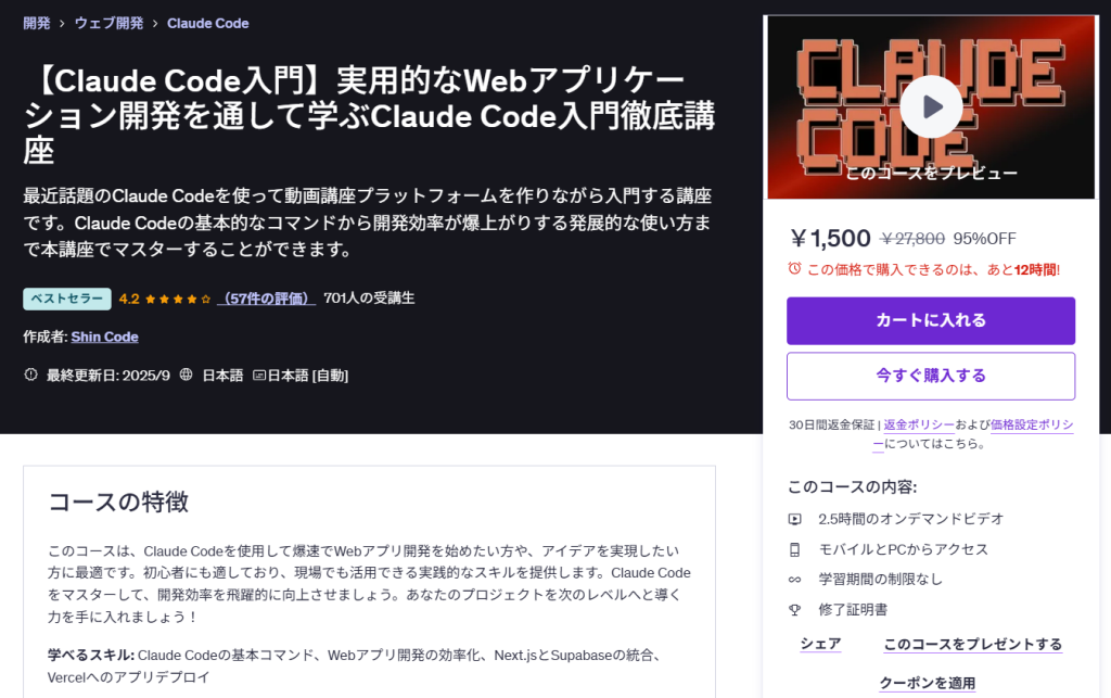 「Claude Codeはもはや全エンジニア必須科目!と本講師が言うように、ぜひ学んで実務に活かしていただきたいです!」