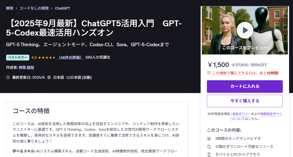 この講座では、GPT-5 Thinking・Codex・Soraを連携させ、実践的なAI開発ワークフローを構築する方法を学べます。わずか3時間で明日から使える次世代スキルを身につけよう!