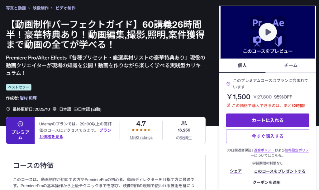 「初めての人にも、経験者として上を目指す人にもオススメの講座。セールでかなりコスパがよいので、動画制作者なら買っておいて損は無いでしょう。」