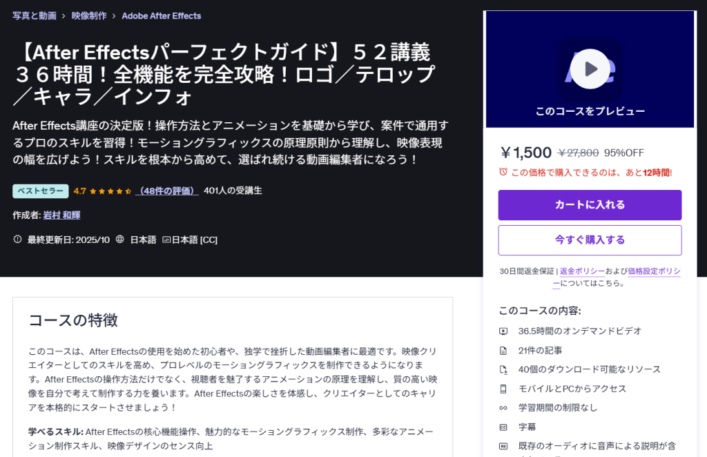 「【After Effectsパーフェクトガイド】52講義 36時間!全機能を完全攻略!ロゴ/テロップ/キャラ/インフォ」