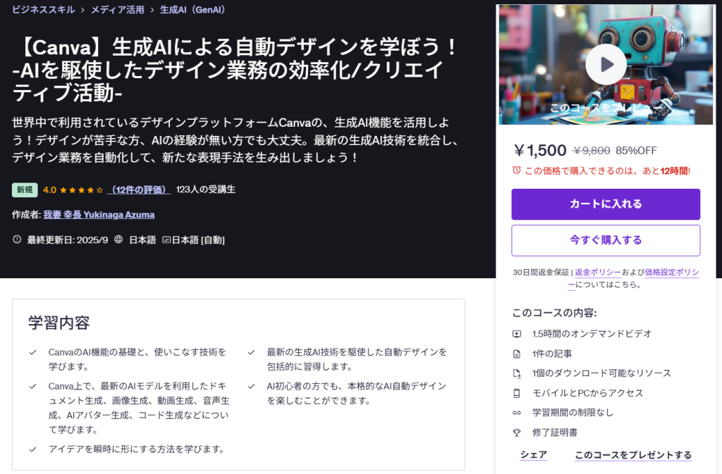 「講座内の解説は25年9月と新しく、今から効率よくCanvaAIを学ぶなら受講を推奨したい講座です!」