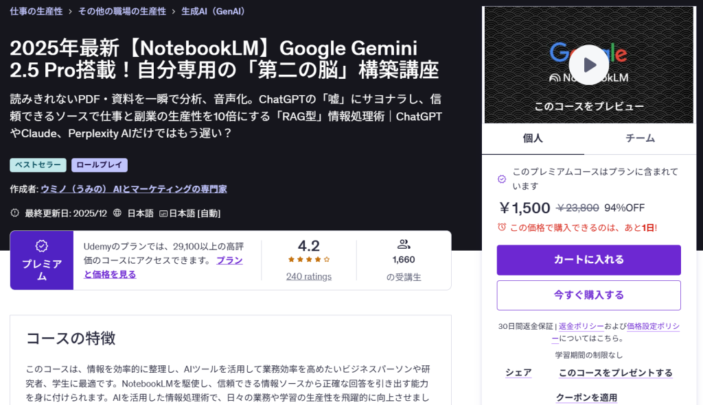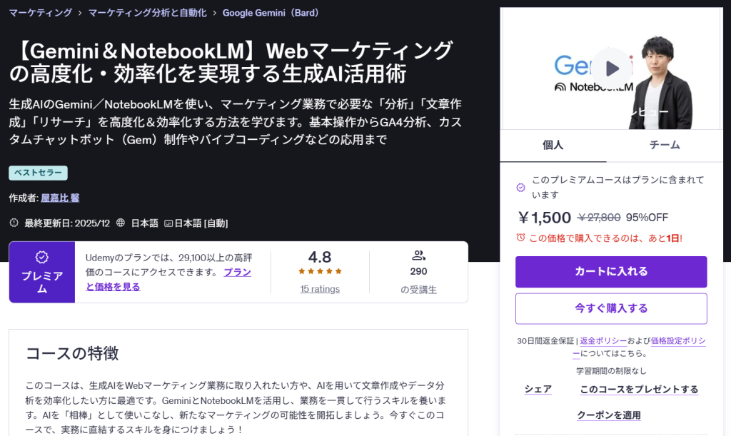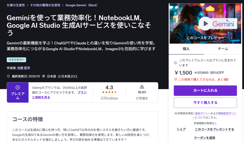 「ChatGPT以外の生成AIを体系的に学べます!Geminiを業務で活用したい初心者にとって、最初の一歩として最適です。」