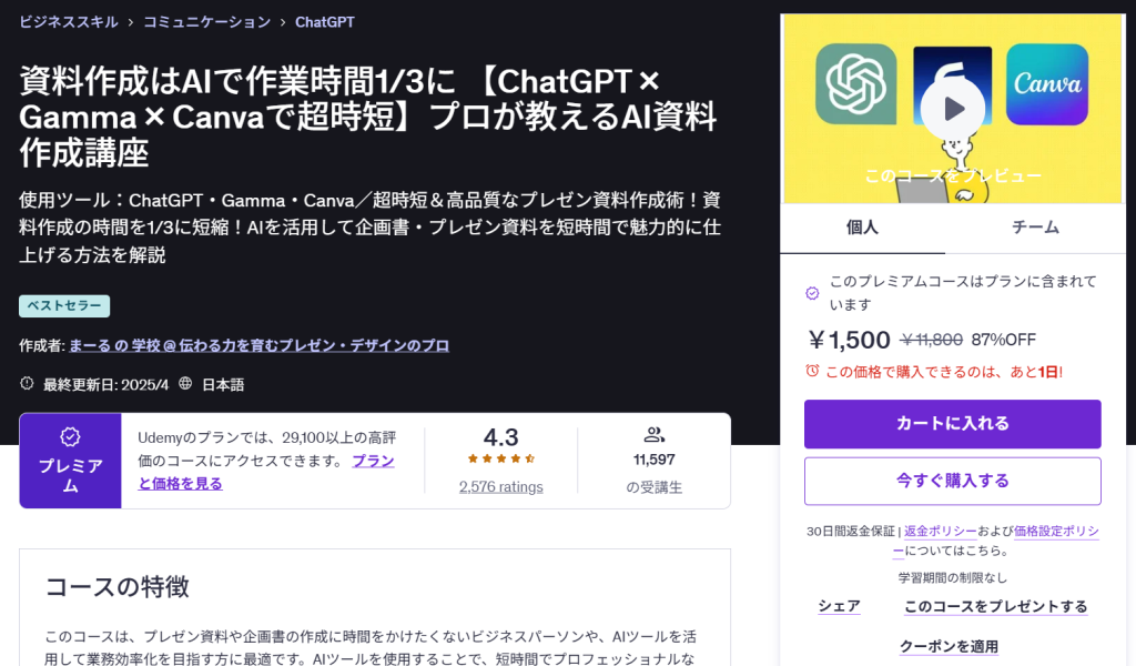 ChatGPTで構成を作り、GammaとCanvaで仕上げるという流れを通じて、スピードと品質を両立する資料作成方法を学べます。