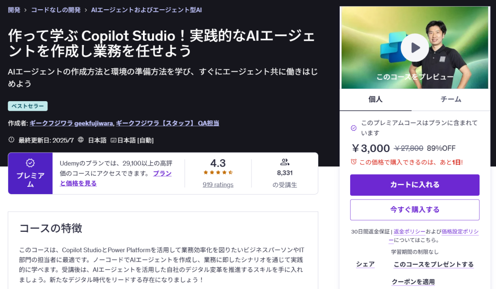 この講座では、Copilot StudioとPower Platformを使い、ノーコードで業務に使えるAIエージェントを実際に構築していきます。