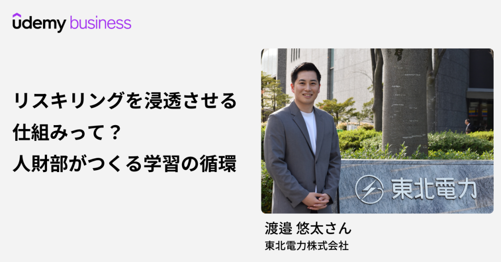 今回は、東北電力株式会社の渡邉 悠太さんにお話を伺いました!渡邉さんは、人財部の担当(人財育成・制度運用)として活躍されつつ、Udemy BusinessでITパスポートやオフィススキル、Power BIなどの実務直結講座を“つまみ食い×聞き勉”で継続されています。