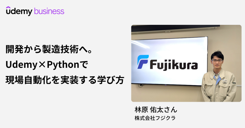 今回は、株式会社フジクラの林原さんにお話を伺いました!林原さんは、メディカル事業推進センター 電子回路部のエンジニアとして活躍されながら、Udemy BusinessでPython や Database をハンズオン中心に学ばれています。ITパスポートについては、インプットを中心とした学習で基礎知識の習得に取り組まれています。そんな学びを自動化ツールの開発につなげ、製造現場の時間短縮に取り組まれていたとのこと。現場業務をデジタルで効率化したい方や、非情報系からプログラミングを始めたい方は、ぜひ参考にしてみてください!