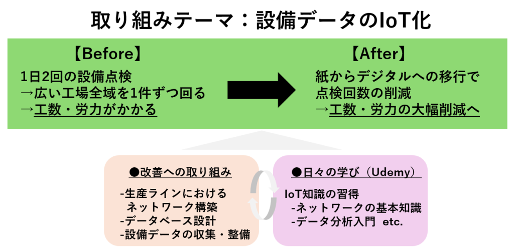 吉原工場では、工場のIoT化の取り組み事例を共有する場として、「デジタル成果物発表会」を月1回開催しています。