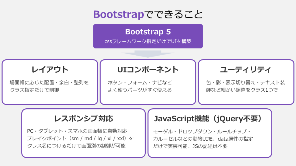 現在主流となっているBootstrap 5も、この本体の最新版です。まずはこのBootstrap本体を使って、グリッドシステムやコンポーネントの基本を押さえるのがおすすめです。