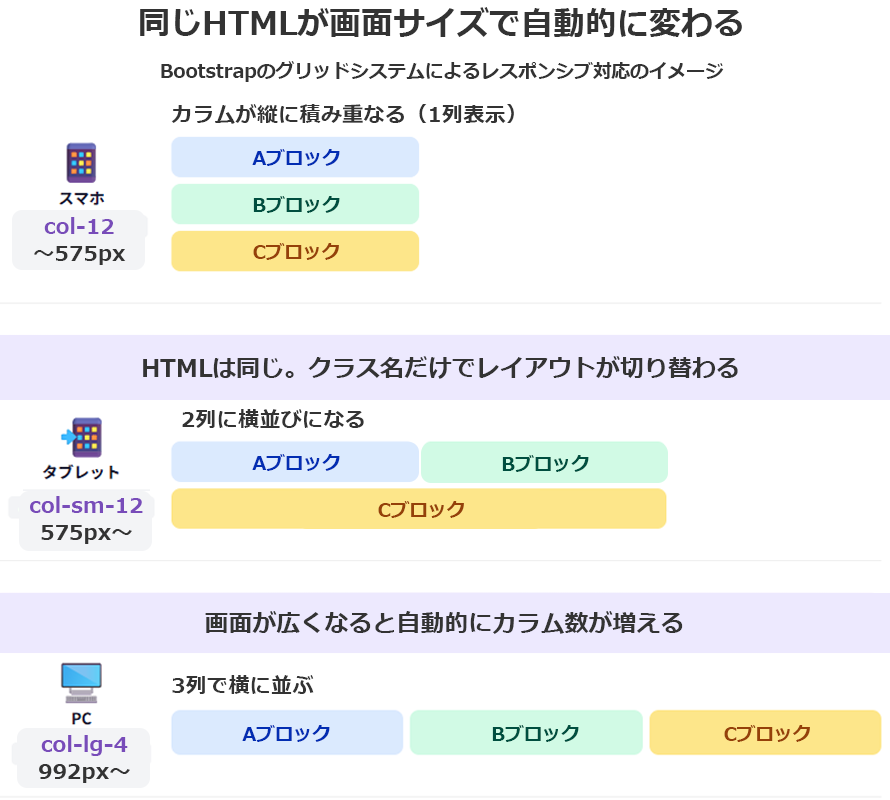 上記のコードのように、「col-{prefix}-{columns}」の形式で合計値12を振り分けます。そうすることで、PCやモバイル・タブレットなど様々なデバイスに対応できるWebページを簡単に作成できます。