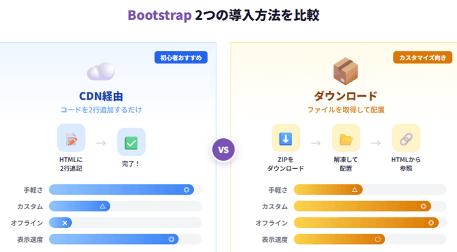 初心者の方には、ファイルのダウンロードが不要で、HTMLにコードを数行追加するだけで始められるCDN経由での導入がおすすめです。注意点として、Bootstrap 5ではjQueryが不要になっています。